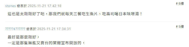 其中,有不少网民嘲讽台当局“时机刚刚好”的说辞:这也是太刚刚好了吧,那我们就每天吃日本生鱼片、寿司,喝味增汤;一定是“无能又卖台”的赖当局做的决定……