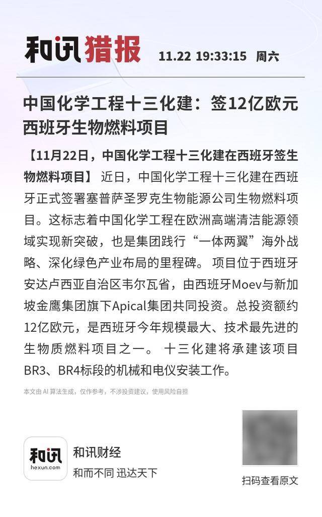 【11月22日,中国化学工程十三化建在西班牙签生物燃料项目】近日,中国化学工程十三化建在西班牙正式签署塞普萨圣罗克生物能源公司生物燃料项目。这标志着中国化学工程在欧洲高端清洁能源领域实现新突破,也是集团践行“一体两翼”海外战略、深化绿色产业布局的里程碑。项目位于西班牙安达卢西亚自治区韦尔瓦省,由西班牙Moev与新加坡金鹰集团旗下Apical集团共同投资。总投资额约12亿欧元,是西班牙今年规模最大、技术最先进的生物质燃料项目之一。十三化建将承建该项目BR3、BR4标段的机械和电仪安装工作。