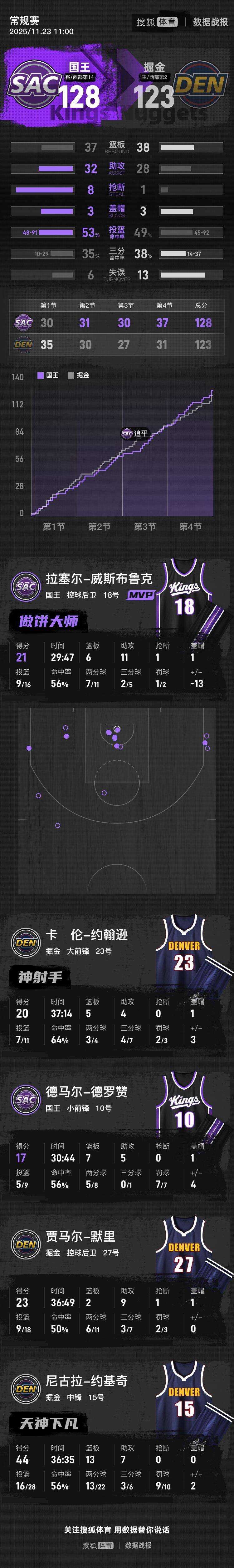 【搜狐体育战报】北京时间11月23日NBA常规赛,客场作战的国王以128-123击败掘金。威斯布鲁克21分6篮板11助攻,约基奇44分13篮板7助攻。