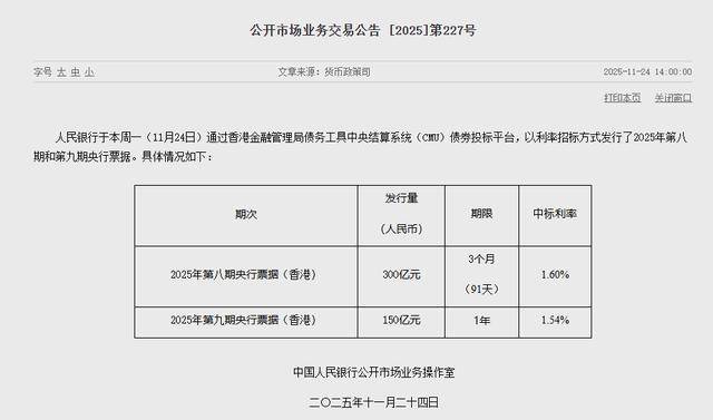 据中国人民银行官网消息,人民银行于本周一(11月24日)通过香港金融管理局债务工具中央结算系统(CMU)债券投标平台,以利率招标方式发行了2025年第八期和第九期央行票据。具体来看,央行在香港发行300亿元人民币3个月期央行票据,息率1.6%;在香港发行150亿元人民币1年期央行票据,息率1.54%。