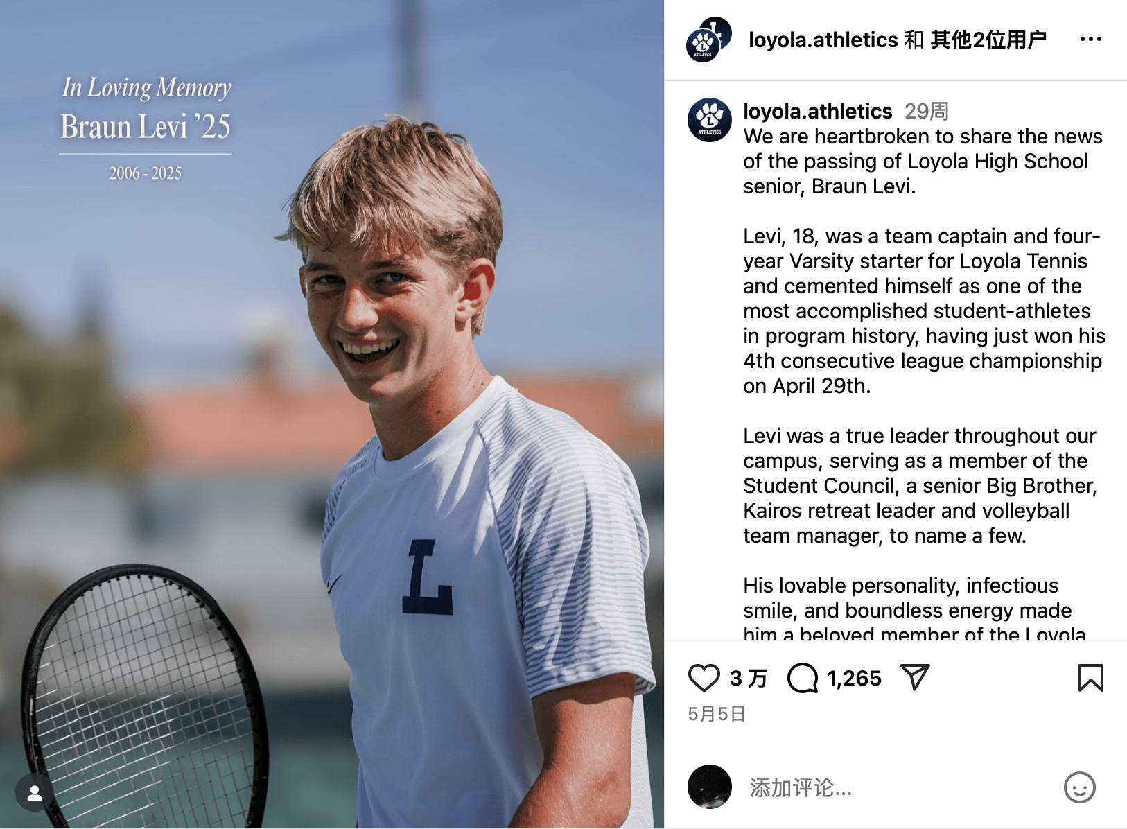 学校体育部随后在Instagram上发文悼念:“利维是我们校园的真正领袖,他曾担任学生会成员、高年级‘大哥哥’、Kairos静修营领袖、排球队经理等等。他可爱的个性、感染力十足的笑容和无限的活力,让他成为洛约拉社区深受喜爱的成员。他是名副其实的‘为他人而活’的人,我们会深深怀念他。我们爱你,布劳恩。”