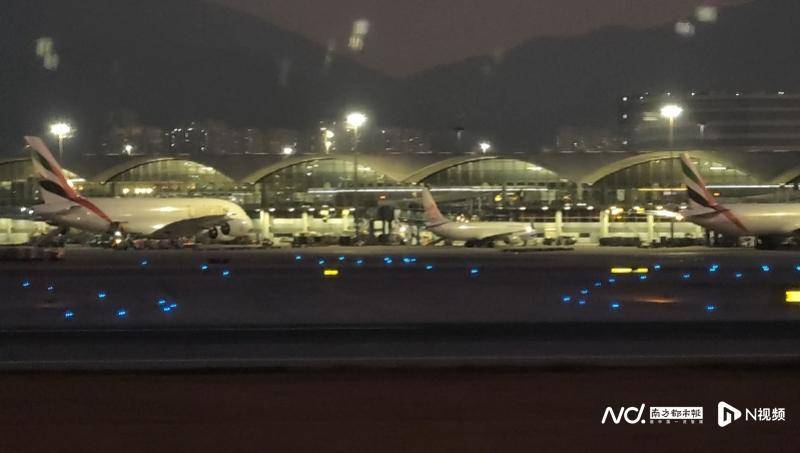 多架阿联酋航空公司的客机正在香港国际机场航站楼停泊接载旅客。