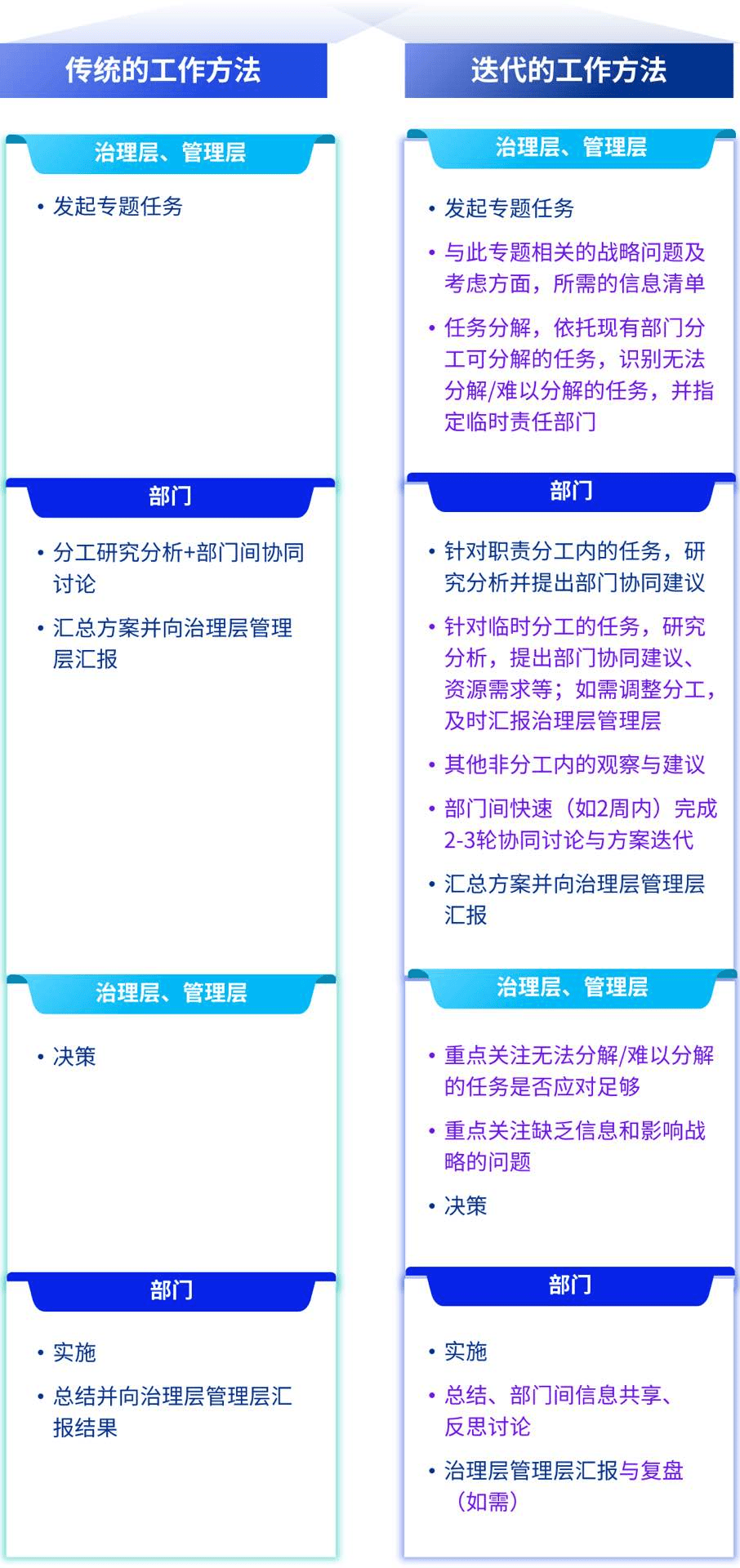 借鉴敏捷项目管理的智慧,构建迭代的工作方法(图1利用迭代的工作方法增加应对方案的有机性),强化工作流程中的信息协同、意见交互与及时反馈;充分发挥管理角色的作用,重点识别信息缺失、部门职责真空、以及影响战略目标实现的问题,聚焦解决实务痛点;同时在解决具体问题之外,将工作目标设定为构建系统化、制度化的长效工作机制,以优化原有管理体系中的结构性问题。