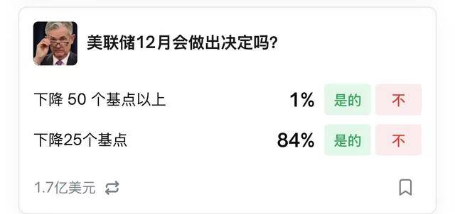 此外,多位美联储官员近日密集发声,包括美联储主席鲍威尔盟友Daly和Williams,支持在12月再次降息,认为劳动力市场面临的风险已超过通胀。这一系列表态推动市场对美联储12月降息的押注概率由几天前的仅30%迅速飙升至80%。截至11月26日,Polymarket预测平台显示,美联储12月降息25个基点的概率为84%。