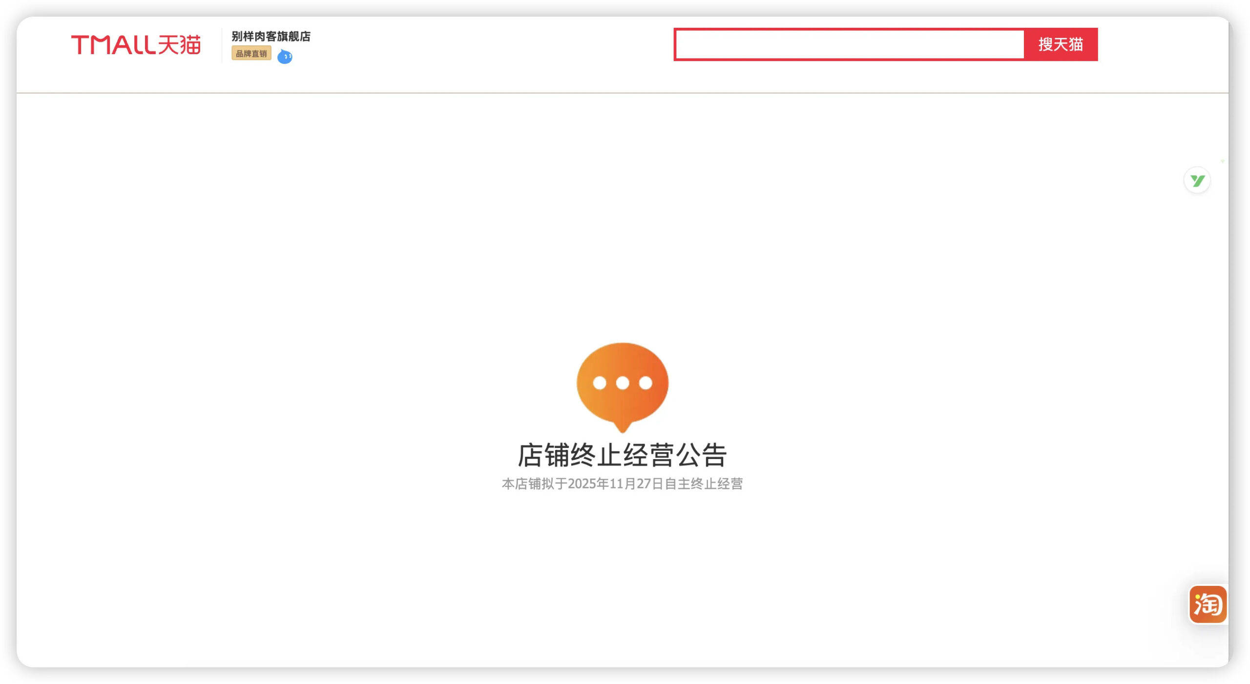 上周晚些时候,在天猫平台上,一家名叫别样肉客的官方旗舰店的首页出现了“拟于2025年11月27日自主终止经营”的关店提示。同时,它在拼多多的旗舰店也进入了无法正常访问和搜寻的状态。