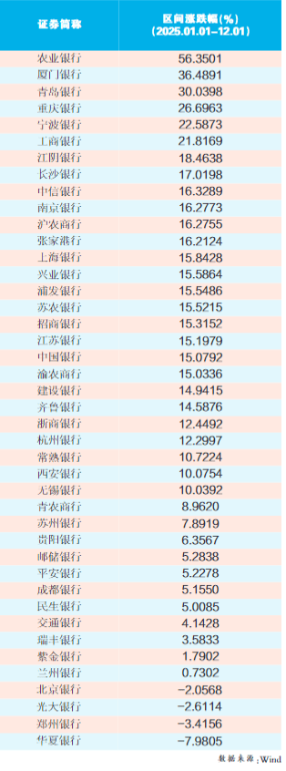 Wind数据显示,截至12月1日,年内A股42家上市银行股价整体表现强劲,38家银行实现正收益,其中,农业银行股价以56%的年内累计涨幅领跑,厦门银行、青岛银行股价年内涨幅均超30%。不过也有华夏银行、光大银行、郑州银行等股价年内累计下跌。