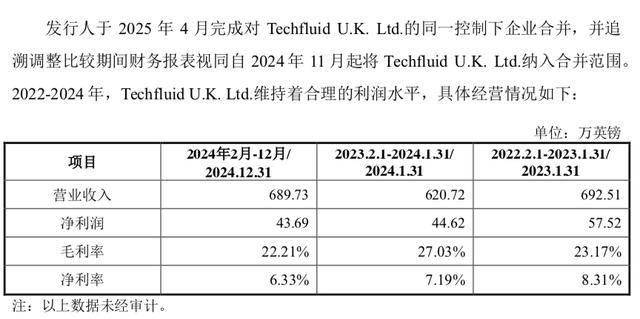 悦龙科技于2025年4月完成对 Techfluid U.K. Ltd.的同一控制下企业合并,并追溯调整比较期间财务报表视同自 2024 年 11 月起将 Techfluid U.K. Ltd.纳入合并范围。