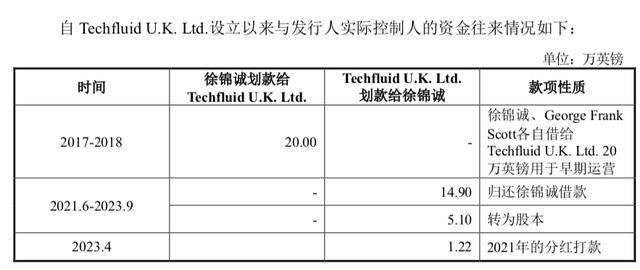 回复文件表示,2021年分红主要系解决C类股东缴纳税款资金的诉求,分红金额较小,具有合理性。Techfluid U.K. Ltd.与实际控制人的资金往来合理,结合 Techfluid U.K. Ltd.大额资金流水的核查情况,Techfluid U.K. Ltd.不存在资金体外循环的情况。