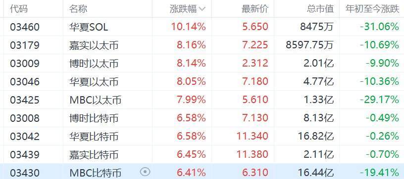 港股市场加密货币现货ETF集体走强,其中,华夏SOL涨超10%,嘉实以太币、博时以太币、华夏以太币涨超8%,MBC以太币涨近8%,博时比特币、华夏比特币、嘉实比特币、MBC比特币涨超6%。