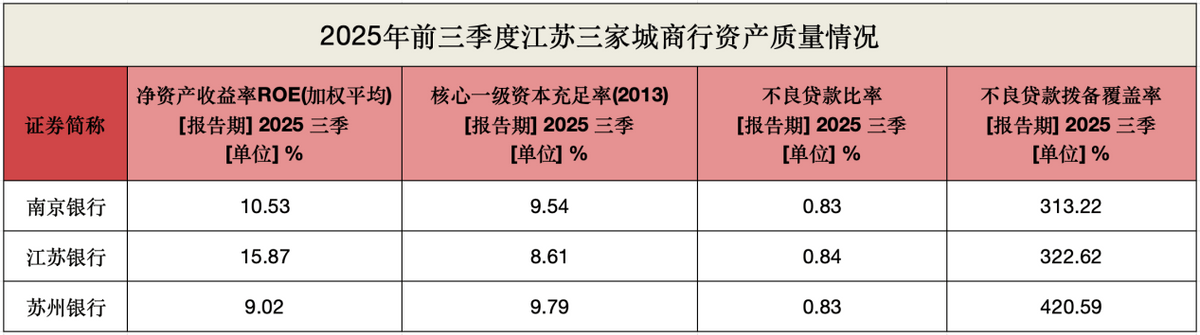 2025年前三季度,江苏银行、南京银行和苏州银行的不良贷款率分别为0.84%、0.83%和0.83%,其中江苏银行较上年末下降0.05个百分点,南京银行和苏州银行较上年末持平。