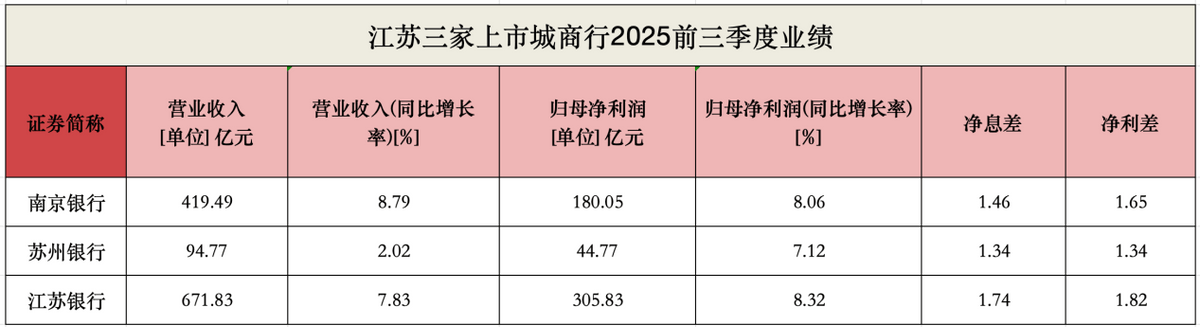 从经营业绩来看,江苏银行、南京银行和苏州银行,2025年前三季度的营收、净利润均实现正增长,其中,营收增速,南京银行排名第一,归母净利润增速,江苏银行排名第一。