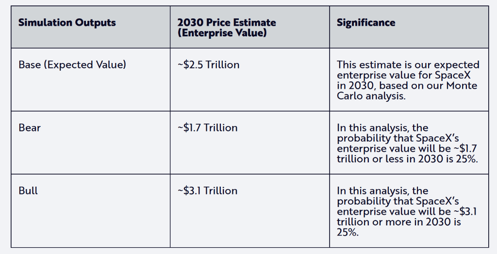 市场的狂热并非凭空而来。回溯至2025年6月10日,知名投资人、“马斯克长期支持者”“木头姐”(Cathie Wood)旗下的ARK投资管理公司就发布了一份开源估值模型报告,预测SpaceX的企业价值到2030年有望达到约2.5万亿美元。