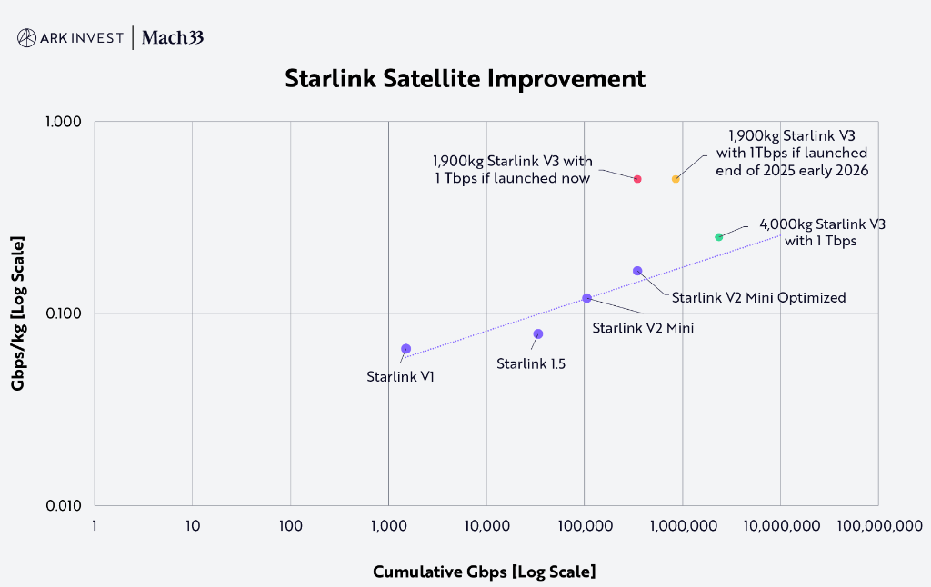 因此,以Gbps/千克衡量的卫星性能成为模型中最敏感的输入变量,影响收入生成和资本支出。卫星性能对带宽部署的效率和成本至关重要,也是决定SpaceX完成星链星座建设速度以及将资本重点转向火星目标的关键。