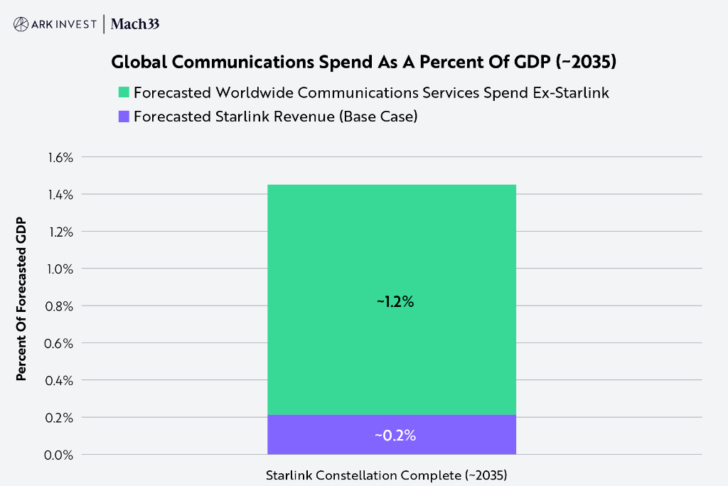 根据我们的基准情景,星链星座约在2035年完成后,ARK研究显示SpaceX可能产生约3000亿美元的年收入,约占全球通信总支出的15%,如下所示。