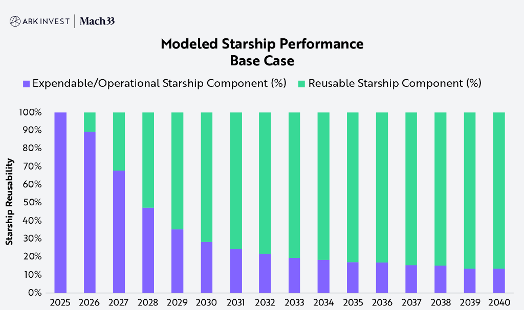 注:根据模型,即使实现快速可重用,星舰的可重用组件也永远不会达到100%,因为每次发射总会产生可变成本,例如燃料。资料来源:ARK Investment Management LLC与Mach33,2025年。本分析使用了截至2025年5月29日的一系列外部数据源,可应要求提供。本文仅提供信息,不应视为投资建议或购买、出售或持有任何特定证券的推荐。预测本身存在固有局限性,不可作为投资决策依据,且基于反映我们自身偏见及对公司长期乐观看法的模型构建。
