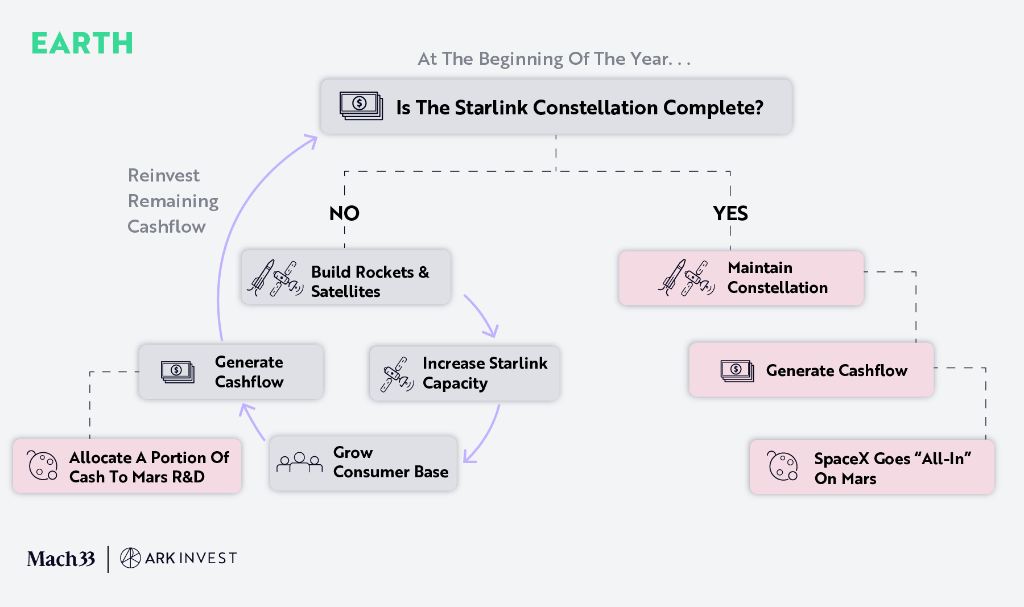 从分析角度看,该模型运作如同一个具有自我强化势头的飞轮,如下图所示:从现金开始,SpaceX制造火箭和卫星,创造轨道带宽,获取星链用户,并再投资产生的现金。随着循环持续,资金逐步流向火星开发,直至星链星座部署完成。