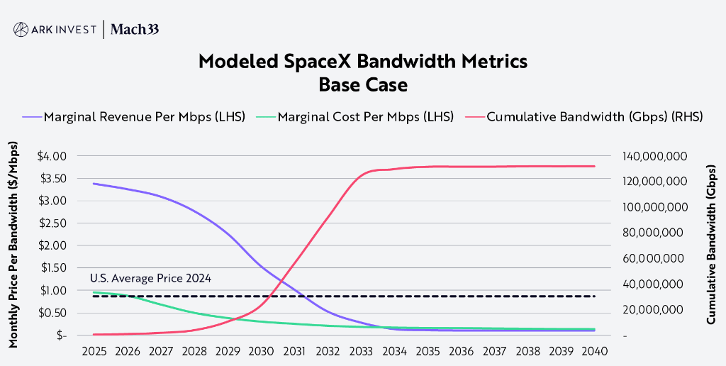 注:美国平均价格仅供参考;每月每Mbps边际收入(紫线)为基于我们自上而下模型的全球数值。资料来源:ARK Investment Management LLC与Mach33,2025年。本分析使用了截至2025年5月29日的一系列外部数据源,可应要求提供。本文仅提供信息,不应视为投资建议或购买、出售或持有任何特定证券的推荐。预测本身存在固有局限性,不可作为投资决策依据,且基于反映我们自身偏见及对公司长期乐观看法的模型构建。