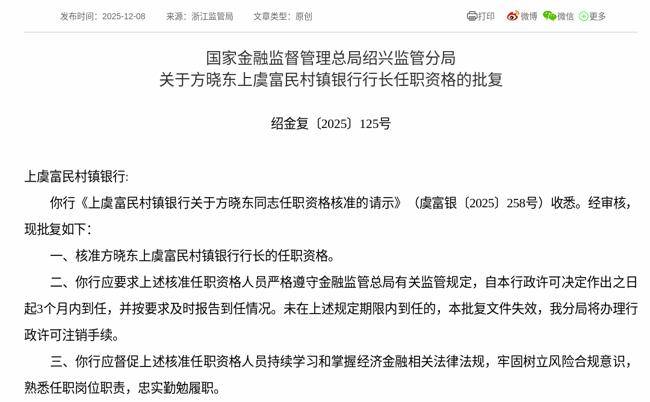 2025年12月8日,根据国家金融监督管理总局消息,《上虞富民村镇银行关于方晓东同志任职资格核准的请示》获得通过,批复方晓东上虞富民村镇银行行长的任职资格。