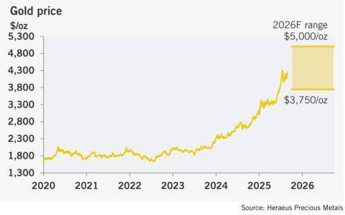 综合多项因素,Heraeus预计金价在2026年将在3750—5000美元/盎司区间运行。