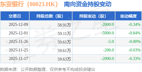 证券之星消息,12月9日南向资金减持2000.0股东亚银行(00023.HK)。近5个交易日中,获南向资金减持的有5天,累计净减持9205.0股。近20个交易日中,获南向资金减持的有20天,累计净减持8.02万股。截至目前,南向资金持有东亚银行(00023.HK)58.91万股,占公司已发行普通股的0.01%。