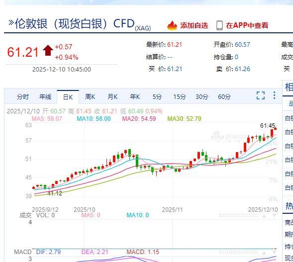 截至发稿,现货白银报61.21美元/盎司,涨幅0.94%。