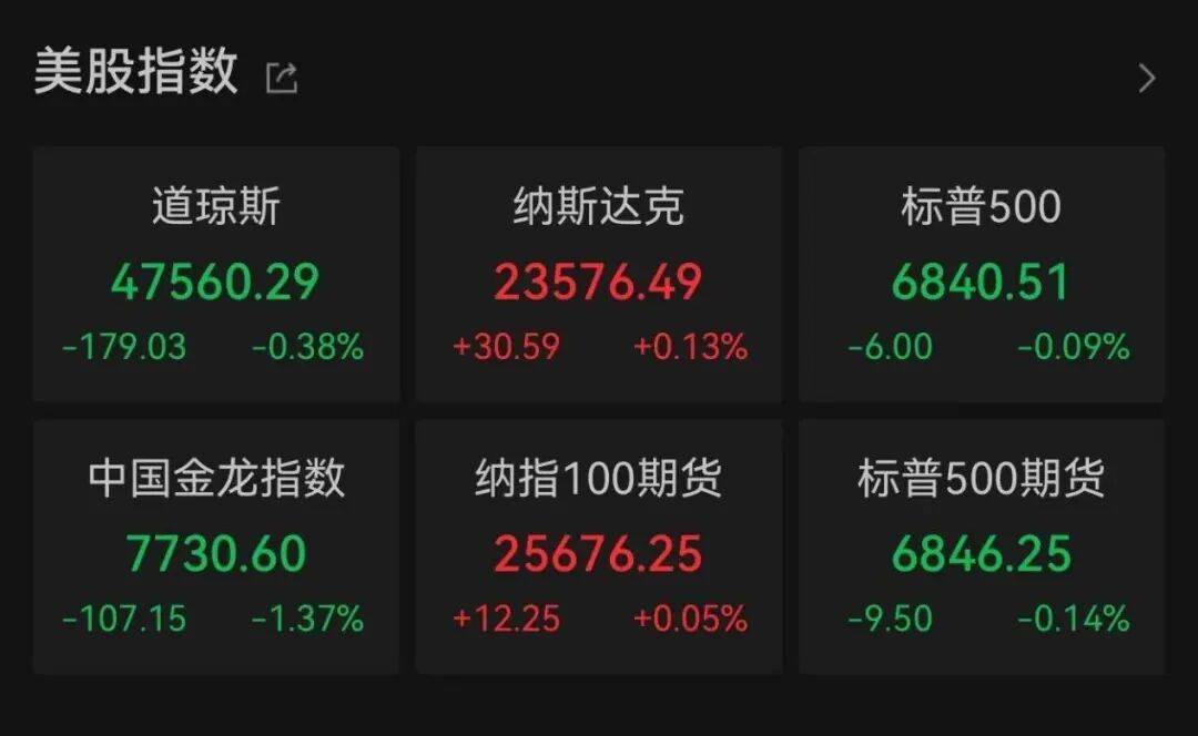 美东时间12月9日(周二),美股三大指数收盘涨跌不一。截至收盘,道琼斯工业指数下跌0.38%,报47560.29点;纳斯达克指数上涨0.13%,报23576.49点;标普500指数下跌0.09%,报6840.51点。
