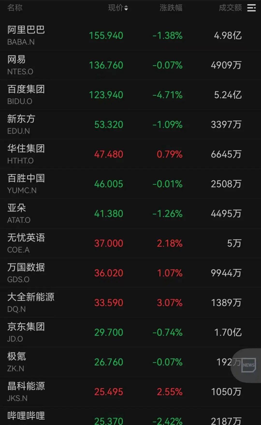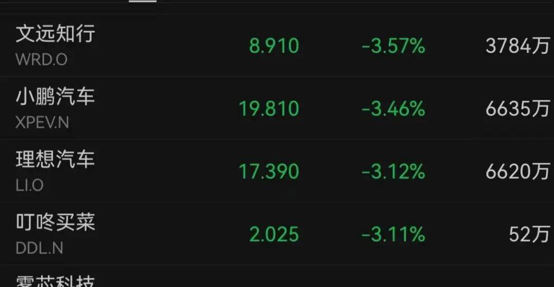 百度下跌4.71%,哔哩哔哩跌超2%,阿里巴巴跌超1%;文远知行、小鹏汽车、理想汽车均收跌超3%。
