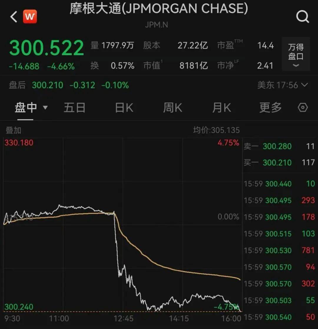 摩根大通股价周二盘中一度下跌4.75%,最终收跌4.66%,拖累银行板块表现。