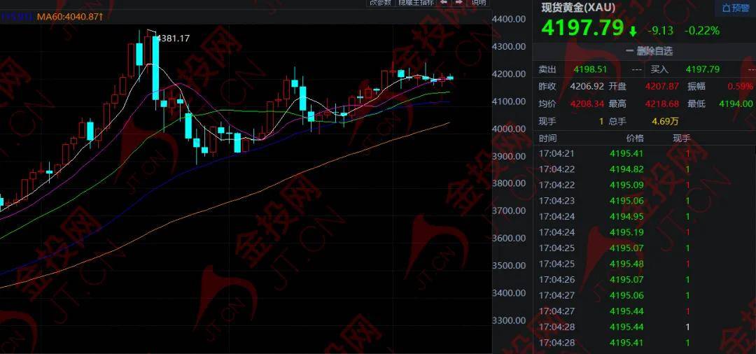 隔夜,现货黄金震荡上行,最终收涨0.39%,最终收报于4206.59美元。今日欧市盘中,黄金窄幅震动,目前在4196美元附近徘徊。