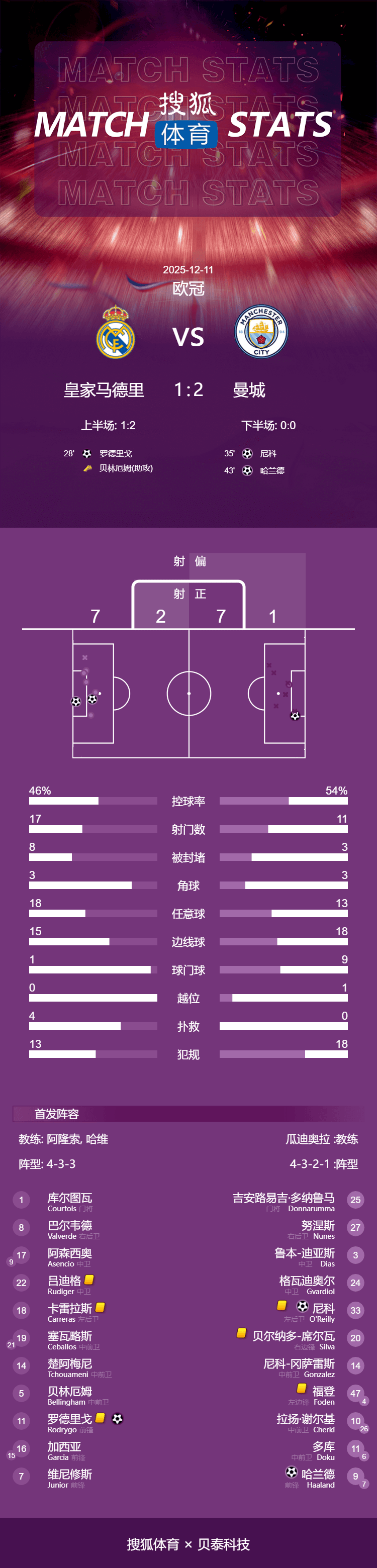 上半场结束,曼城2-1领先皇马。