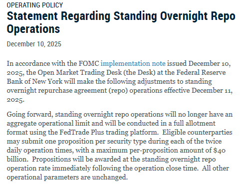 纽约联储当地时间12月10日发布声明称,根据联邦公开市场委员会(FOMC)当日发布的说明,纽约联储公开市场操作交易台将于11日起调整隔夜回购操作。