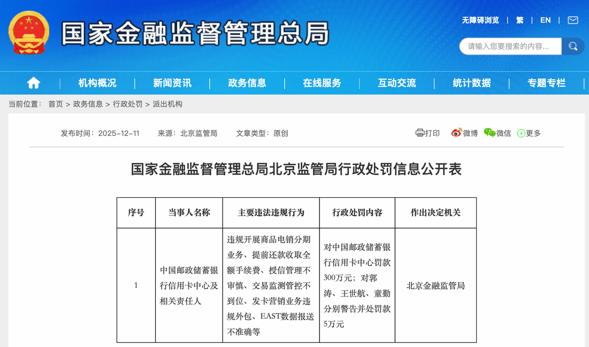 12月11日,国家金融监督管理总局北京监管局行政处罚信息公开表显示,中国邮政储蓄银行信用卡中心,因违规开展商品电销分期业务、提前还款收取全额手续费、授信管理不审慎、交易监测管控不到位、发卡营销业务违规外包、EAST数据报送不准确等,被罚款300万元;同时,对郭涛、王世航、童勤分别警告并处罚款5万元。