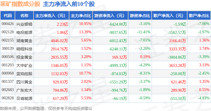 资金流向方面,采矿指数(399232)成份股当日主力资金净流入合计2.54亿元,游资资金净流出合计3.01亿元,散户资金净流入合计4658.68万元。成份股资金流向详情见下表: