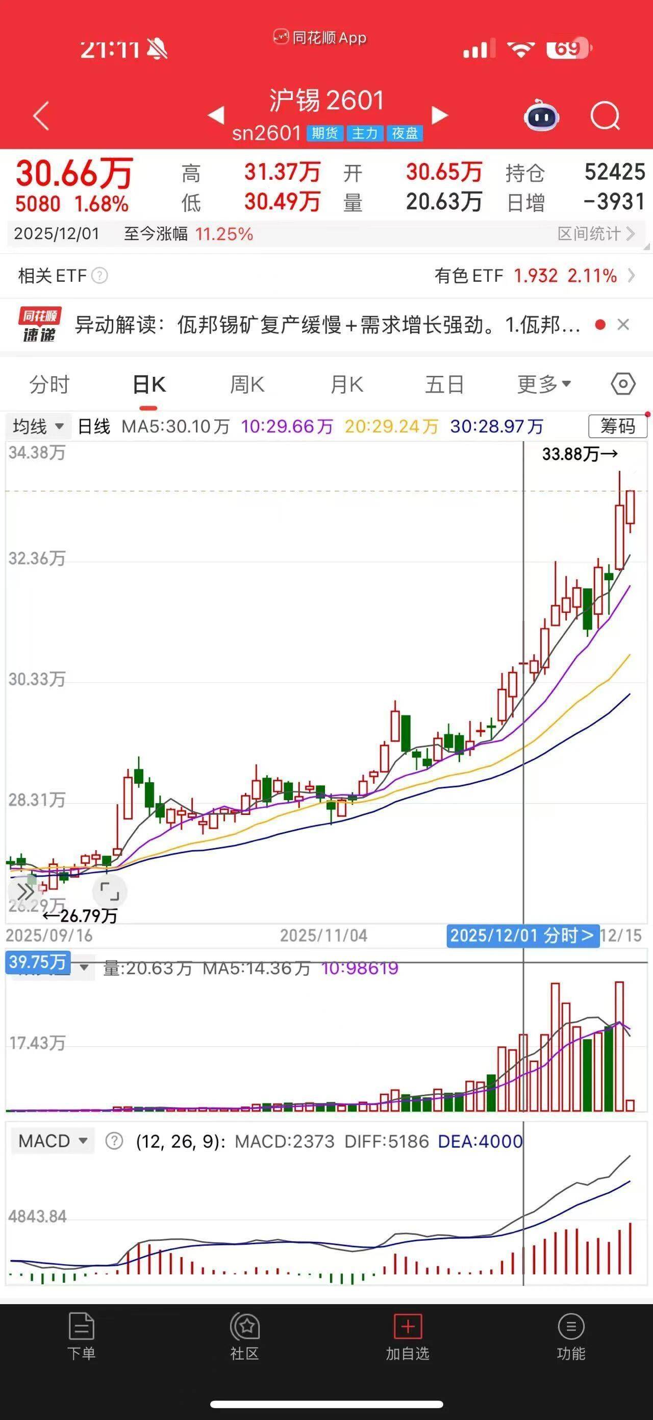 昨日,上期所发布公告称,自2025年12月17日交易(即12月16日晚夜盘)起,锡期货SN2601合约日内平今仓交易手续费调整为6元/手。