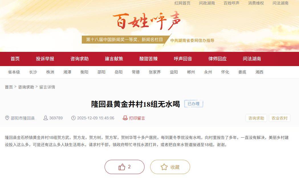 有事找红网丨网友反映隆回县金石桥镇黄金井村18组无水喝 镇政府回复:尽快采取相应措施