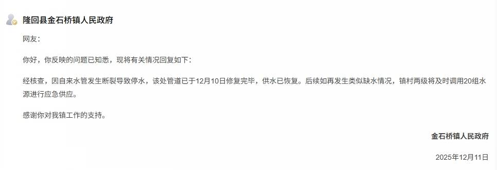 在采访中,金石桥镇政府相关负责人承认,目前黄金井村18组确实没有铺设自来水管网,他们将尽快采取相应措施,争取早日解决村民的用水难题。但让村民感到奇怪的是,镇政府在红网《百姓呼声》栏目回复时却给出了不同的说法,“经核查,因自来水管发生断裂导致停水,该处管道已于12月10日修复完毕,供水已恢复。后续如再发生类似缺水情况,镇村两级将及时调用20组水源进行应急供应。”