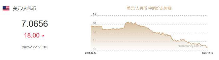 中新网12月15日电 据中国外汇交易中心网站消息,中国人民银行授权中国外汇交易中心公布,2025年12月15日银行间外汇市场人民币汇率中间价为:1美元对人民币7.0656元,下调18个基点。