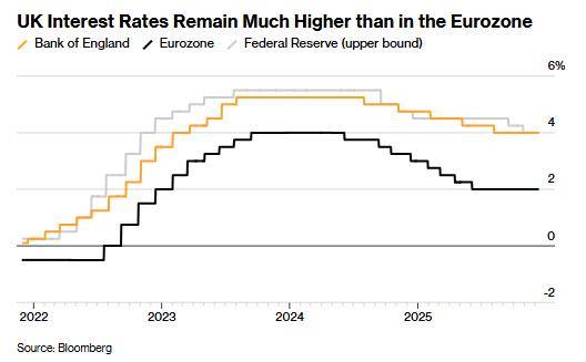 摩根士丹利、凯投宏观等机构的分析师认为,经济前景的持续恶化将倒逼政策制定者进一步降息。接受一项调查的经济学家预计,英国央行基准利率将在明年下半年降至3.25%。相比之下,投资者的预期更为悲观,他们押注最终的基准利率将稳定在3.4%左右。这意味着,若英国央行下周如期降息,那么政策制定者仅剩余一次25个基点的降息空间——若再进一步降息,就可能面临刺激通胀反弹的风险。