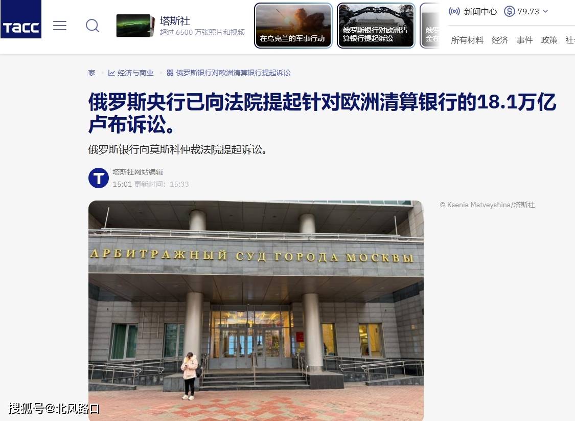 12月15日,莫斯科仲裁法院新闻处向俄塔斯社证实,俄罗斯央行已向莫斯科仲裁法院提起诉讼,索赔金额达18.2万亿卢布(18,172,971,903,836卢布),被告为欧洲清算银行。