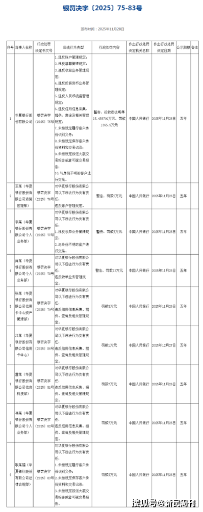 2025年的最后一个月尚未开始,华夏银行便有20多张罚单加身。这些罚单的出处不但有央行、金融监管总局,也不乏各地监管分局。更让人吃惊的是,罚单涉及的违规领域也几乎涵盖了银行业务的各个核心环节——从信贷“三查”不到位到信贷资金挪用,从违法发放借名贷款到集团客户统一授信管理缺位……华夏银行合规管理的种种漏洞无处遁形。