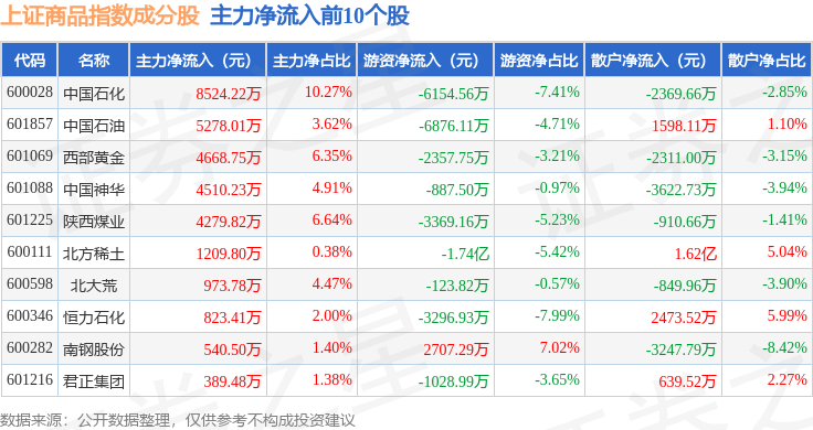 资金流向方面,上证商品(000066)指数成份股当日主力资金净流出合计37.08亿元,游资资金净流入合计9.04亿元,散户资金净流入合计28.03亿元。成份股资金流向详情见下表: