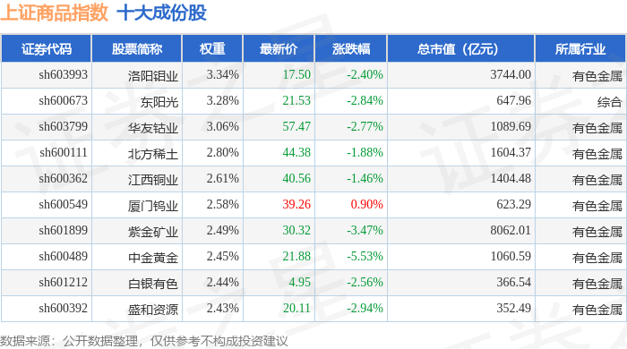 证券之星消息,12月16日,上证商品(000066)指数报收于3283.79点,跌2.17%,成交474.87亿元,换手率0.57%。当日该指数成份股中,上涨的有9家,南钢股份以2.0%的涨幅领涨,下跌的有41家,西部黄金以7.61%的跌幅领跌。
