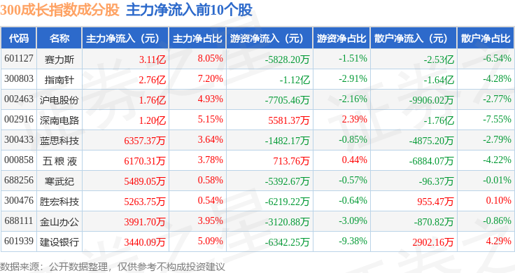 资金流向方面,300成长(000918)指数成份股当日主力资金净流出合计115.09亿元,游资资金净流入合计48.6亿元,散户资金净流入合计66.49亿元。成份股资金流向详情见下表: