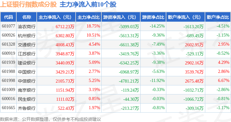 资金流向方面,上证银行(000134)指数成份股当日主力资金净流出合计3.25亿元,游资资金净流出合计2.63亿元,散户资金净流入合计5.88亿元。成份股资金流向详情见下表: