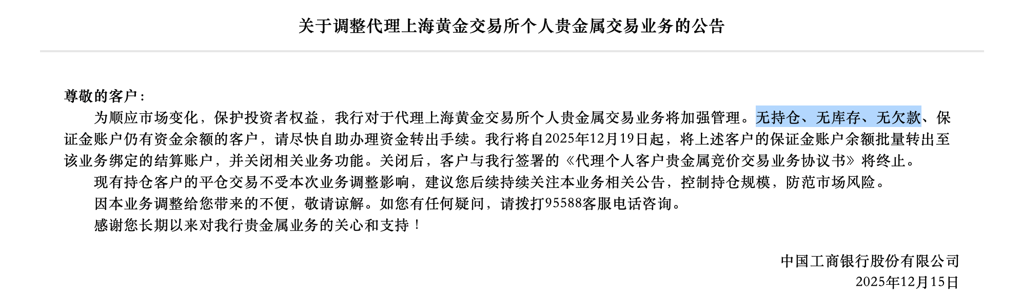 12月15日,工商银行公告自12月19日起关闭代理上金所个人贵金属交易的“三无”(无持仓、无库存、无欠款)客户的相关业务功能,提醒账户仍有余额的客户及时转出。