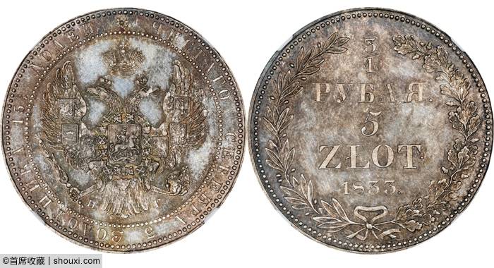1837年波兰10兹罗提,NGC-AU,压印饱满,钱文清晰,380美元落槌;1833年波兰尼古拉一世5兹罗提,NGC-PF63+,底光绵柔,酱灰包浆,质感良好,2.2万美元落槌,含佣约合人民币18.74万元成交;1839年波兰2兹罗提,NGC-MS63+,打制清晰,棕色包浆,2600美元落槌。
