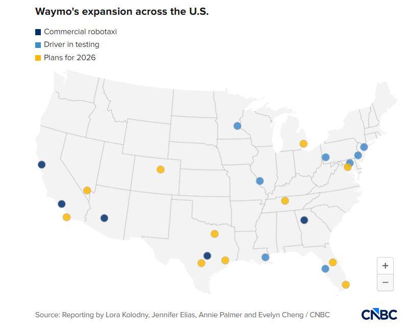 最近几周,Waymo发布了一系列公告,计划明年进一步拓展robotaxi业务版图。2026年,Waymo计划在达拉斯、丹佛、底特律、休斯顿、拉斯维加斯、迈阿密、纳什维尔、奥兰多、圣安东尼奥、圣地亚哥和华盛顿特区开通服务。该公司还宣布计划于2026年在伦敦推出服务,这将是Waymo首次进军海外服务区域。