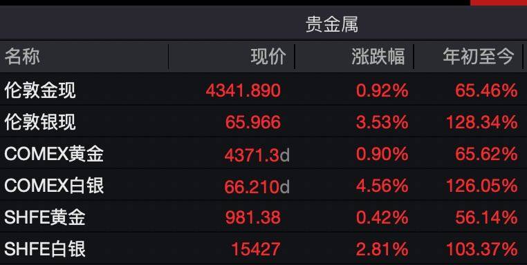 截至发稿,伦敦金现报4341.890美元/盎司,最新涨幅为0.92%。伦敦银现维持高位,最新涨幅为3.53%,COMEX白银涨幅更是扩大至4.56%。