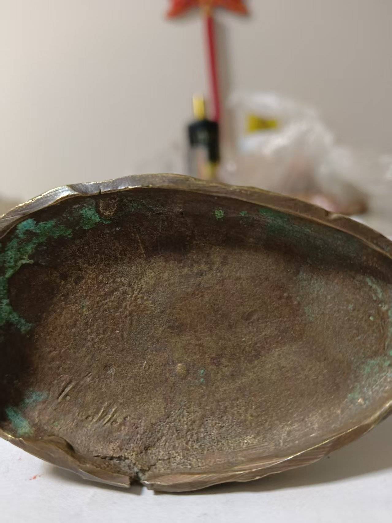 从材质与工艺层面观之,这尊九通官羊摆件选用优质黄铜为原料,经熔铸、捶打、雕刻、做旧等多道工序精心打造,尽显传统铜器锻造的精湛技艺。黄铜本身色泽沉稳古朴,经岁月沉淀后形成的包浆温润醇厚,局部自然生成的铜绿(碱式碳酸铜)更是时光赋予的独特印记,既印证了材质的纯粹性,又为摆件增添了古朴的历史质感。摆件的铸造工艺尤为考究,整体采用失蜡法熔铸成型,羊身的肌肉线条流畅自然,羊角的螺旋纹理细腻逼真,从羊角的卷曲弧度到羊蹄的蹬踏姿态,每一处细节都刻画得栩栩如生,毫无机械铸造的生硬感。而羊身所缀的九枚铜钱与足下的“乾隆通宝”大钱,更是采用浮雕工艺精雕细琢,钱币上的文字笔画清晰、纹路规整,与羊身的立体造型形成鲜明的视觉层次,足见匠人锻造时的用心与功力。