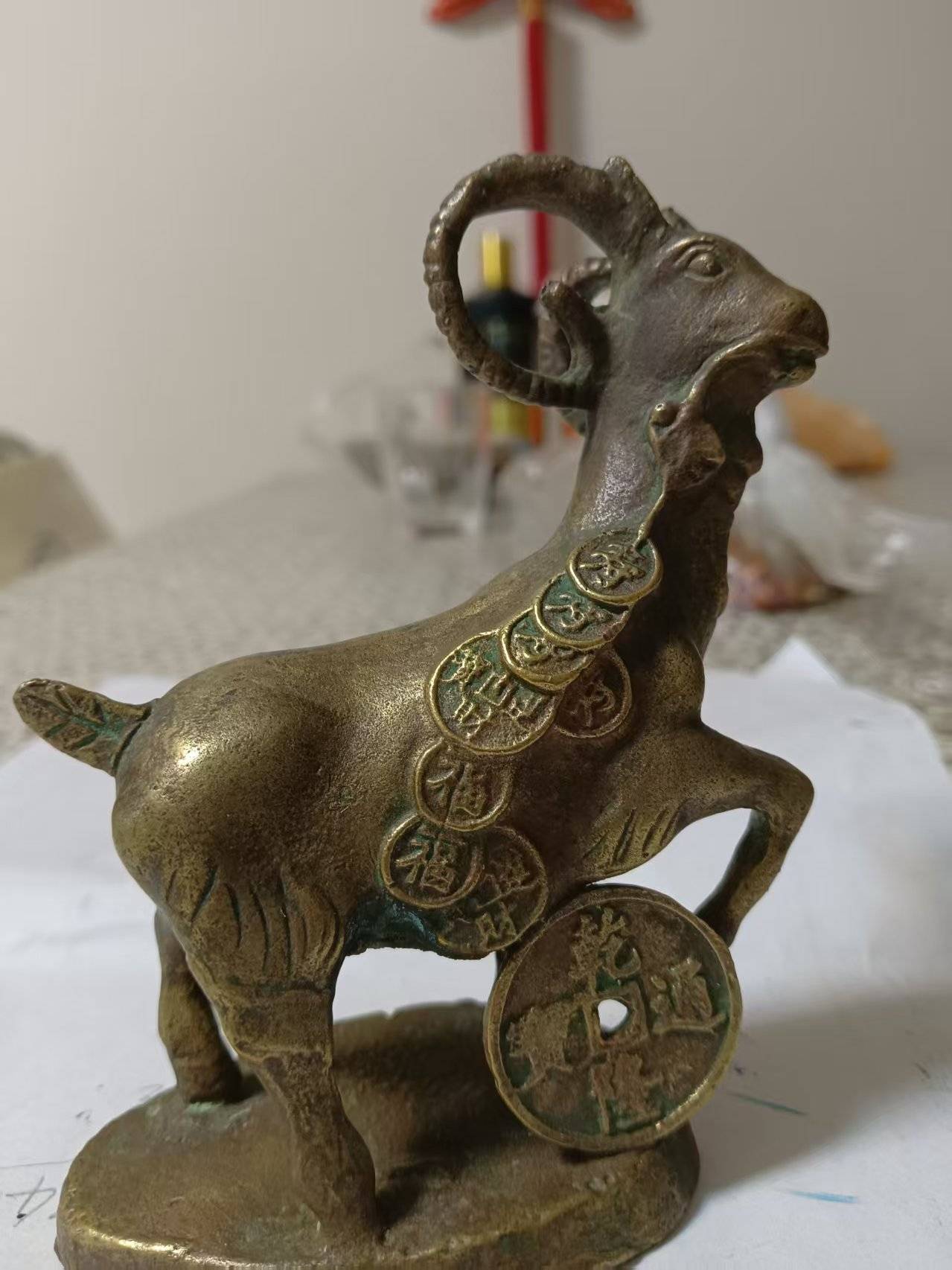 再看造型设计,这尊九通官羊摆件的形态构思堪称巧夺天工。羊的整体姿态呈昂首挺胸、前蹄蹬踏之势,羊角螺旋盘绕直指天际,尽显昂扬向上的精气神,既契合了羊在传统文化中“祥”的本义,又赋予了摆件“步步高升”的美好期许。羊身佩戴的九枚铜钱排列错落有致,“九”在中式文化中为阳数之极,代表着“九五之尊”“九九归一”,象征着极致的尊贵与圆满;而铜钱上的“福”“禄”等字样与“乾隆通宝”大钱相呼应,将“招财进宝”“富贵满堂”的寓意具象化。尤为精妙的是,摆件的底座与羊身浑然一体,圆形底座既稳固了整体造型,又暗合“天圆地方”的中式宇宙观,让摆件在视觉上更具平衡之美,也让吉祥寓意与传统哲学实现了深度融合。